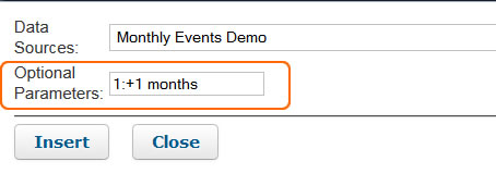 For better versatility it's advised to specify these arguments as user parameters in the ruleset and give specific values when you insert the data source. For instance, here is the recommended argument list if you want to display the monthly events as list:
