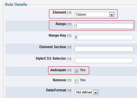 In we want to enable cell merging on the first column, all we have to do is to add a new rule with the following settings: