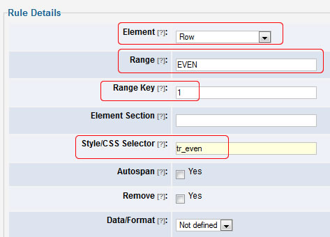 One interesting situation arises when you want to create the zebra effect, by setting the styling of the even rows differently than the odd rows. If autospan is enabled on the column element, the result may not be what we had in mind. For instance, in the example below we wanted to created the zebra effect, where the row changes based on the value of the first column. This is indicated by setting the range key = 1, which means "change the row count every time there is a new item on the 1st column". If you had set the range key = 2, then the row count would change every time there was a new item on the second row and so on. The default value range key = 0 means the the row count will change every time there is a new item on any row.