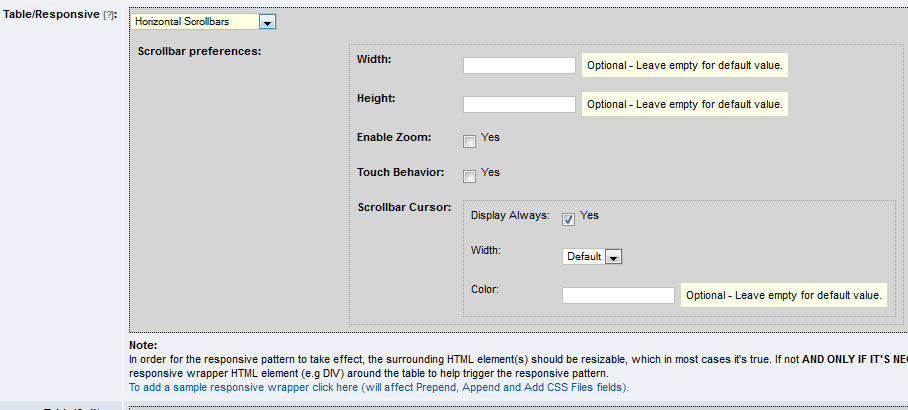 So, normally the scrollbars will appear only when the container area is smaller than the content area, which in our discussion let's assume it's always a table. This is important to understand because if you have selected to apply the responsive pattern horizontal scrollbars or any other option that is using scrolling, the scrollbars may never appear if the container has a fixed size (non-responsive) that is larger than the width of the table.