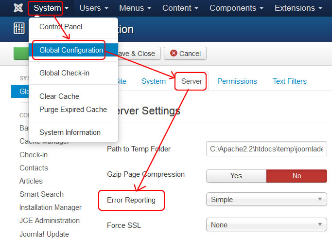 Login as admin. Select menu System -> Global Configuration -> Server (tab).