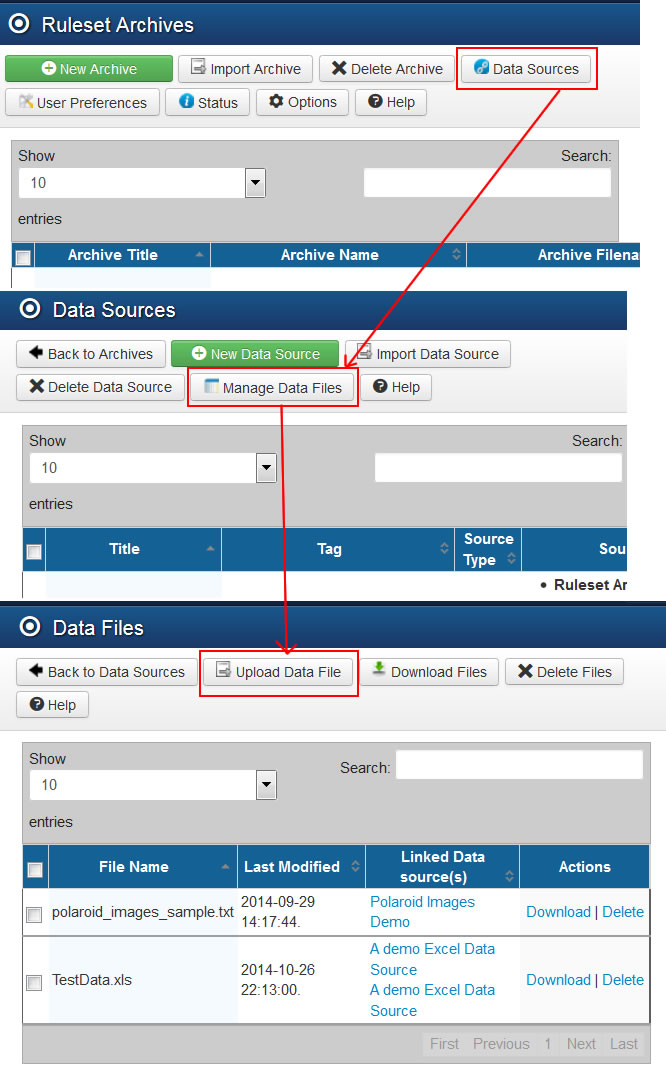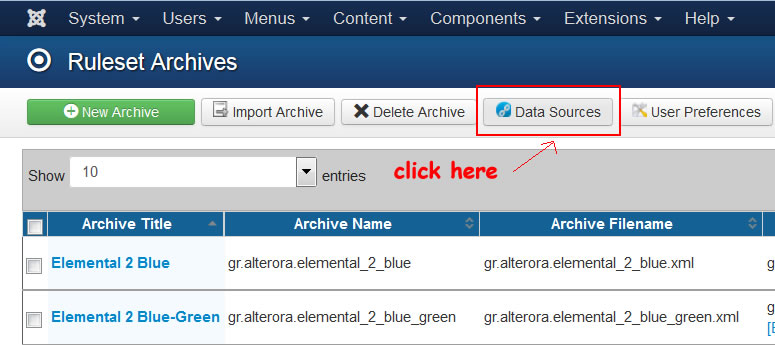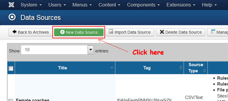 The file uploading can be done with an FTP client, but you can also try to use the Data Manager which will load the files into the "Data" directory templates/tabulizer/data. This is very helpful, because all files that reside in the data folder can be accessed by the data source without the need to specify any other path, as shown in the example below.