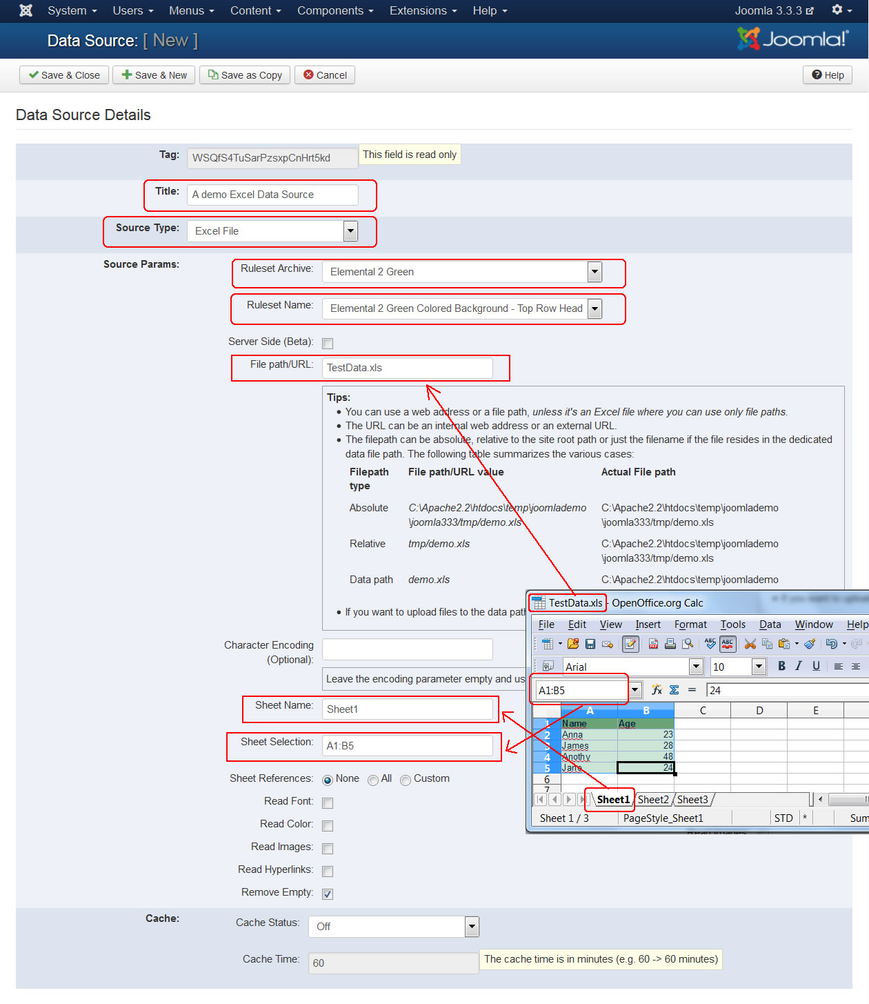 - If the external data source (i.e. Excel file) is modified before the data source expires you need to manually clean the cache by clicking on the relevant link.