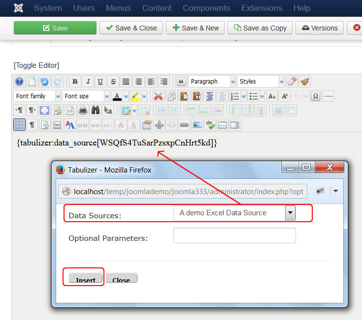 Once the data source has been created you insert it into the article. The actual table data will appear only in the front-end when the table is rendered.
