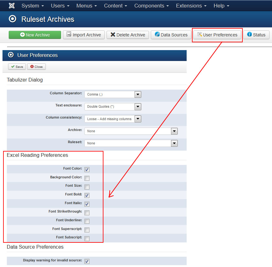 You can check any of this options if you want to preserve the font attributes, font and background colors, images and hyperlinks. Specifically for the font and the color options, there are a few sub-options that are accessible via the User Preferences panel. For instance, if you check the "Read Color" importation option, only the font color will be preserved, unless the background color is checked in the Excel Reading Preferences section of the User Preferences panel.