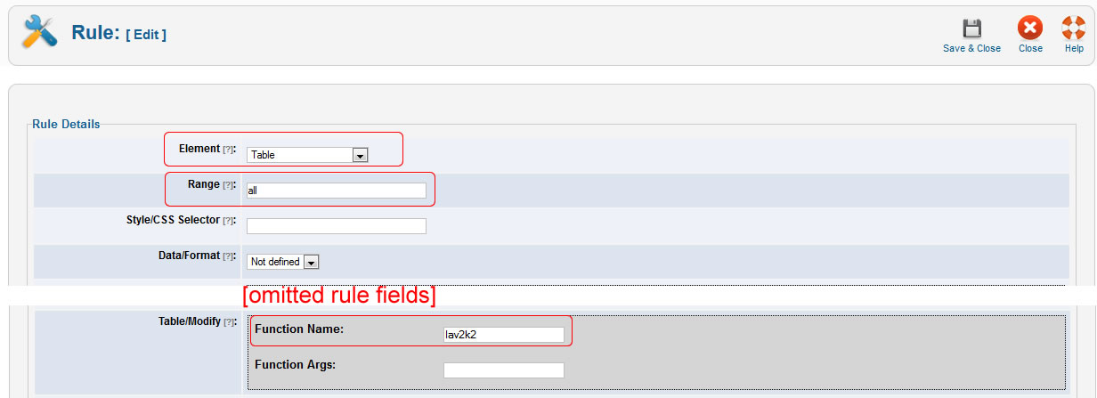 5. The modification function is called by the ruleset, that contains some other styling rules. Here is the table rule we added in order to call the modification function named lav2k2: