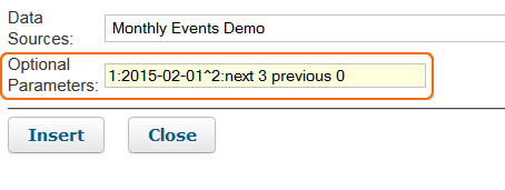 For better versatility it's advised to specify these arguments as user parameters in the ruleset and give specific values when you insert the data source. For instance, here is the recommended argument list if you want to display the monthly events as list: